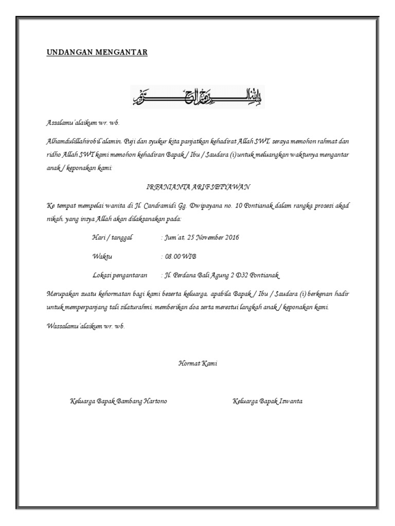 Dalam arti begini pihak calon pengantin mengadakan acara ini khusus untuk lingkungan yang ada di sekitarnya tanpa wajib mengundang pihak dari keluarga calon pengantin pria begitu juga sebaliknya yang dilakukan oleh pihak calon pengantin pria. Dengan kerendahan hati Kami mengundang Bapak Ibu Saudara i untuk bersama sama mengantar Anak Kemanakan Ipar Kami Mempelai laki laki Atas Nama. Undangan Mengantar Kepada Yth.
