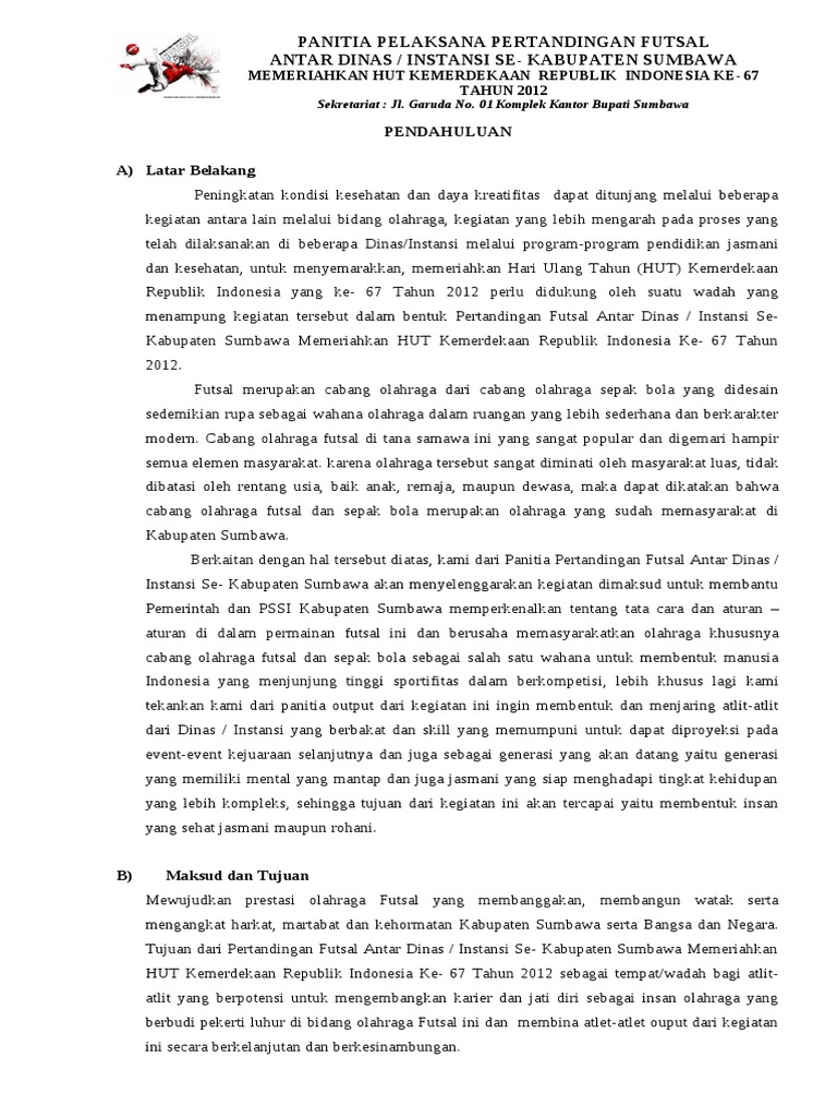 PROPOSAL PERMOHONAN BANTUAN DANA UNTUK MENGIKUTI TURNAMEN FUTSAL 2016 A. Download contoh proposal kegiatan futsal doc kali ini saya akan memposting contoh proposal kegiatan futsal. Blog Kumpulan Skripsi Ekowisata Pantai.