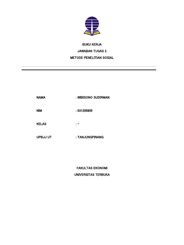 020331701 Tugas 3 METODE PENELITIAN SOSIAL 1. Rika Mutiara Nim. JAWABAN TUGAS 2 METODE PENELITIAN SOSIALdocx - BUKU KERJA JAWABAN TUGAS 2 METODE PENELITIAN SOSIAL NAMA WIBISONO SUDIRMAN NIM 031200805 KELAS UPBJJ UT Pembiasaan Berbagi Tempat Penelit ian.